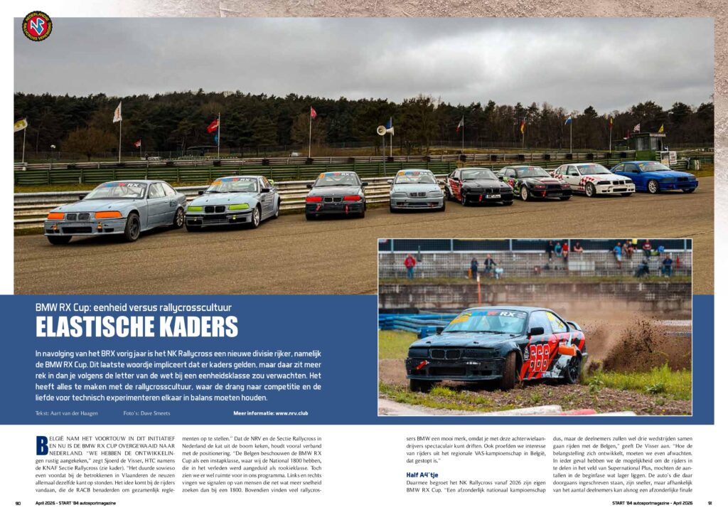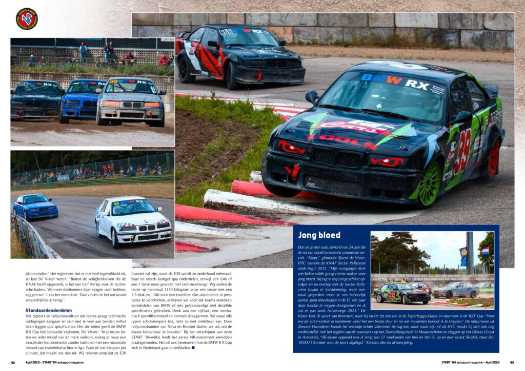 Het typeert de rallycrosscultuur dat teams graag technische uitdagingen aangaan en zich niet te veel aan banden willen laten leggen qua specificaties. Om die reden geeft de BMW RX Cup hen bepaalde vrijheden. De Visser: “In principe heten we ieder model van dit merk welkom, zolang er maar een zescilinder benzinemotor zonder turbo en met een maximale inhoud van tweeënhalve liter in ligt. Twee of vier kleppen per cilinder, dat maakt ons niet uit. Wij rekenen erop dat de E36 favoriet zal zijn, want de E30 wordt zo onderhand onbetaalbaar en steeds lastiger qua onderdelen, terwijl een E46 of een 1 Serie meer gewicht met zich meebrengt. Wij stellen de norm op minimaal 1130 kilogram voor een versie met een 2.5-blok en 1100 voor een tweeliter. Om uitschieters in prestaties te voorkomen, schrijven we voor dat teams standaardonderdelen van BMW of iets gelijkwaardigs met dezelfde specificaties gebruiken. Denk aan een vijfbak, een mechanisch sperdifferentieel en normale draagarmen. We staan alle typen schokdempers toe, mits ze niet instelbaar zijn. Dure rallycrossbanden van Nova en Hoosier sluiten we uit, om de klasse betaalbaar te houden.” Bij het verschijnen van deze START ’84-editie heeft het eerste NK-evenement inmiddels plaatsgevonden. Het zal ons benieuwen hoe de BMW RX Cup zich in Nederland gaat ontwikkelen.