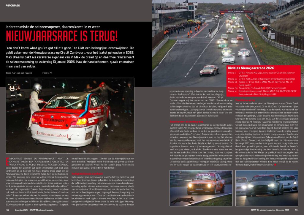 Endurance binnen de autorensport kent de laatste jaren een aanzienlijke opleving, en waar vraag is, volgt meestal vanzelf aanbod. Voeg daarbij het gegeven dat oude sentimenten zich niet laten verdringen en je begrijpt wat Max Braams ertoe dreef om de Nieuwjaarsrace te laten terugkeren. Geen heel winterkampioenschap? “In aanvang niet, want we willen eerst de belangstelling peilen en bekijken hoe succesvol we dit kunnen neerzetten, maar voor het volgende seizoen behoort dit zeker tot de serieuze opties en ik sluit niet uit dat we daar andere circuits bij zullen betrekken,” verklaart de organisator. “Assen bijvoorbeeld, maar misschien ook wel een baan in Duitsland, zoals Oschersleben of Hockenheim.” Laten we echter niet op de muziek vooruitlopen en ons focussen op het nieuws van nu, dat voor veel teams en rijders in de autorensport verheugend zal klinken. Zij hebben zaterdag 10 januari 2026 waarschijnlijk zojuist al in de agenda aangekruist. “Ik spreek zoveel mensen die zeggen: ‘Jammer dat de Nieuwjaarsrace niet meer bestond.’ Menigeen heeft er een heel fijn gevoel aan overgehouden en daarom willen we de traditie graag voortzetten, inclusief een aantal uren rijden in het donker.”