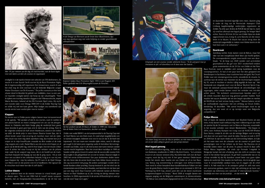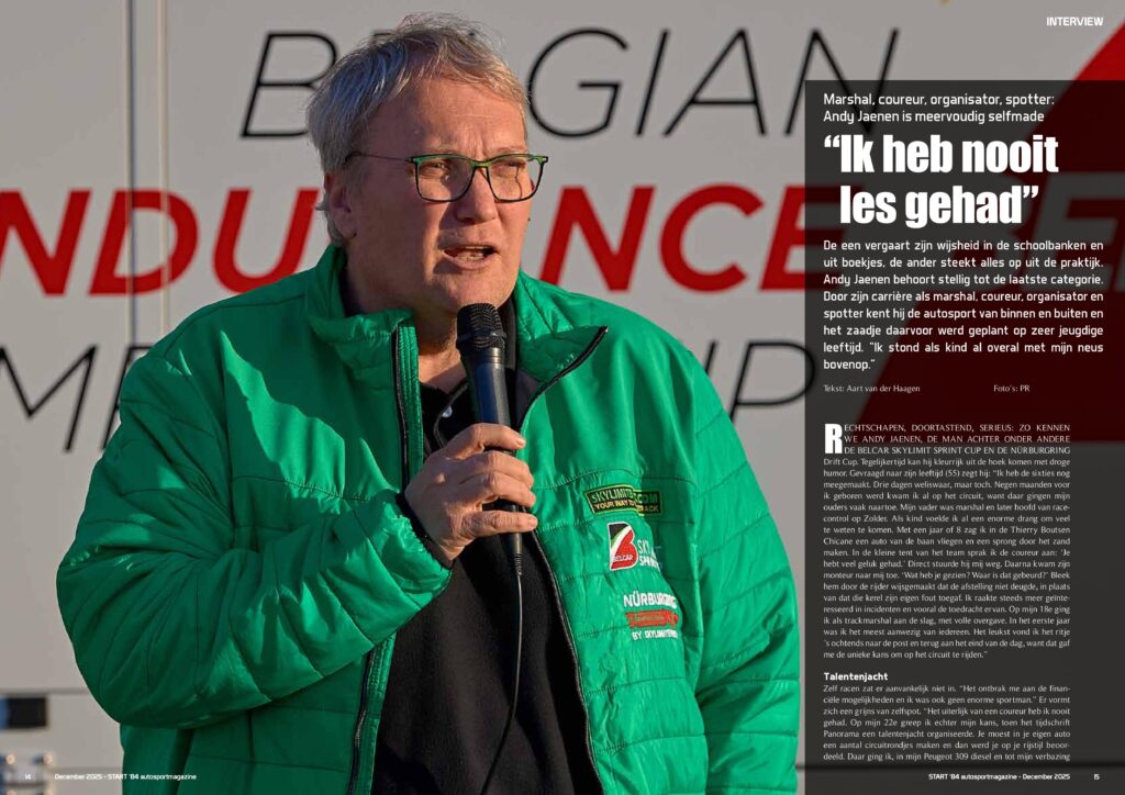 Rechtschapen, doortastend, serieus: zo kennen we Andy Jaenen, de man achter onder andere de Belcar Skylimit Sprint Cup en de Nürburgring Drift Cup. Tegelijkertijd kan hij kleurrijk uit de hoek komen met droge humor. Gevraagd naar zijn leeftijd (55) zegt hij: “Ik heb de sixties nog meegemaakt. Drie dagen weliswaar, maar toch. Negen maanden voor ik geboren werd kwam ik al op het circuit, want daar gingen mijn ouders vaak naartoe. Mijn vader was marshal en later hoofd van racecontrol op Zolder. Als kind voelde ik al een enorme drang om veel te weten te komen. Met een jaar of 8 zag ik in de Thierry Boutsen Chicane een auto van de baan vliegen en een sprong door het zand maken. In de kleine tent van het team sprak ik de coureur aan: ‘Je hebt veel geluk gehad.’ Direct stuurde hij mij weg. Daarna kwam zijn monteur naar mij toe. ‘Wat heb je gezien? Waar is dat gebeurd?’ Bleek hem door de rijder wijsgemaakt dat de afstelling niet deugde, in plaats van dat die kerel zijn eigen fout toegaf. Ik raakte steeds meer geïnteresseerd in incidenten en vooral de toedracht ervan. Op mijn 18e ging ik als trackmarshal aan de slag, met volle overgave. In het eerste jaar was ik het meest aanwezig van iedereen. Het leukst vond ik het ritje ’s ochtends naar de post en terug aan het eind van de dag, want dat gaf me de unieke kans om op het circuit te rijden.”