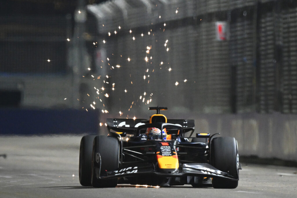SINGAPORE, SINGAPORE – OCTOBER 05: Sparks fly behind Max Verstappen